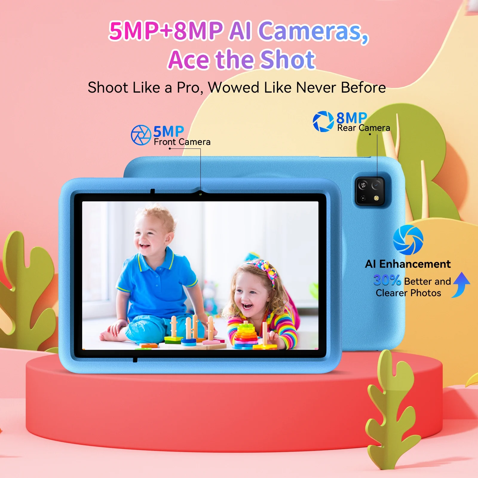 The Blackview Tab 30 Kids Computer Tablet is perfect for your child’s learning and play. The 10 inch tablet display makes stories and lessons fun and engaging. Powered by the Allwinner A133P processor, it offers smooth performance for games and apps. Capture special moments with the 5MP rear and 2MP front camera. With 2GB RAM (expandable up to 4GB, total 6GB) and 64GB ROM (expandable to 128GB), there is plenty of space for photos, videos, and apps. The kids tablet includes a soft TPU case that helps protect it from drops. Running on the 2024 Android 13 system with a kid-friendly theme, this Android tablet offers a rich visual experience for your child. Tab 30 kids touchscreen tablet is great gift for back to school/birthday.
