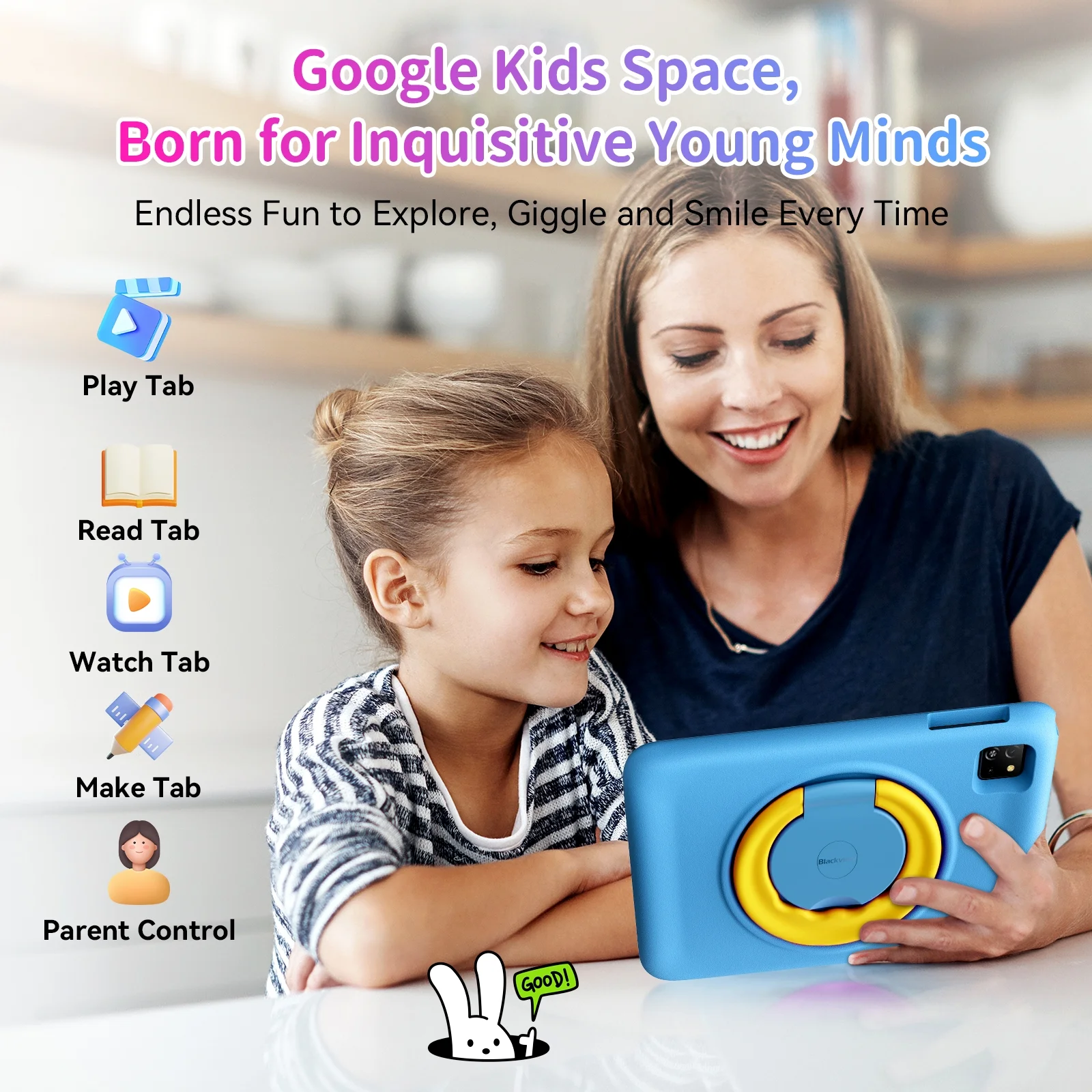 - Google Kids Space: Toddler tablet which with Google Kids Spac is customized lots of apps, games, videos and books based on kids’ interests and ages, allowing them to nurture logical thinking and develop hands-on skills while having fun at will.