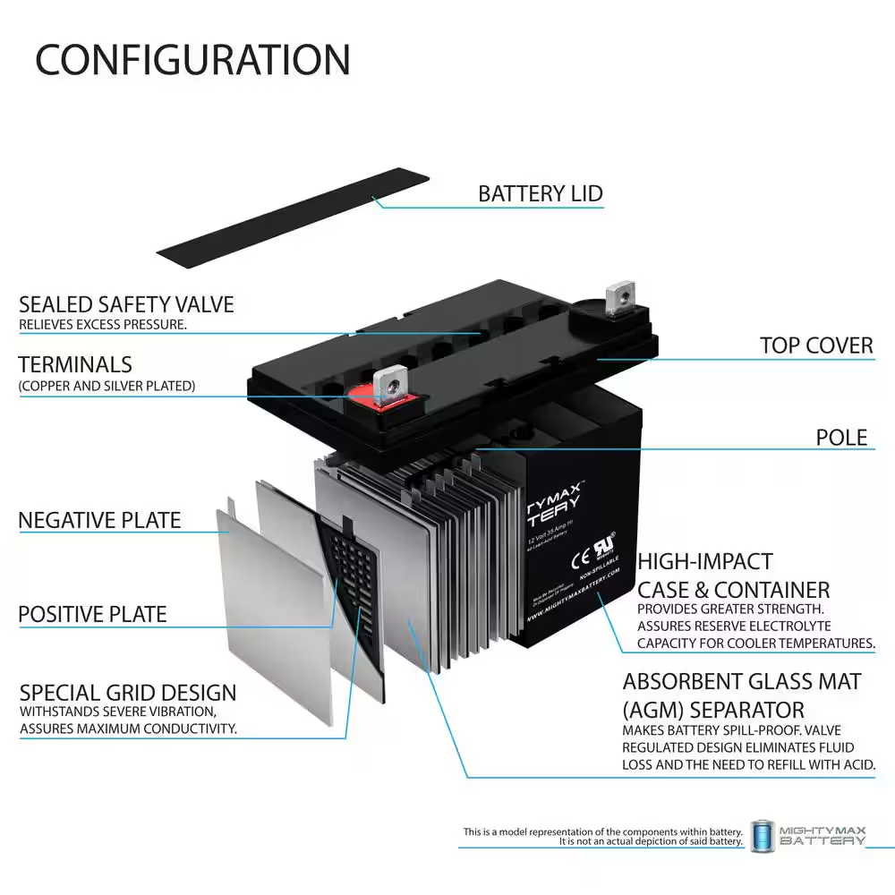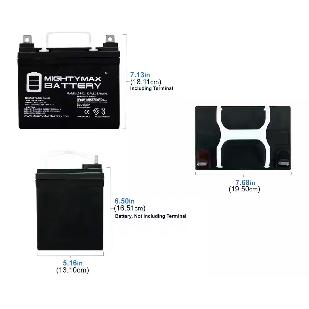 Delivering power when you need it, the MIGHTY MAX ML35-12 12-Volt 35 Ah uses a state of the art, heavy-duty, calcium-alloy grid that provides exceptional performance and service life in both float and cyclic applications. The ML35-12 is an Absorbent Glass Mat (AGM) technology with a valve regulated design, that can be used in enclosed and indoor environments without leaking or maintenance, providing a superior performance for thousands of models. MIGHTY MAX SLA batteries are utilized in a wide variety of applications including, Consumer Electronics, Electric Vehicles, Engine Starters, Golf Carts, Hunting, Lawn and Garden Tools, Medical Mobility, Motorcycles, Power sports, Portable Tools, Solar, Toys and Hobby, Access Control Devices, Emergency Lighting, Security and more.