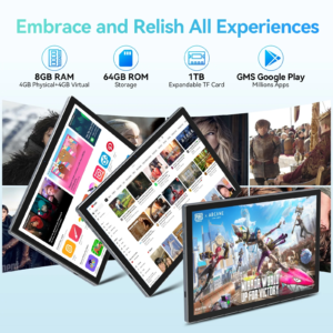 - 👍8GB RAM 64GB ROM and Powerful Processor:Experience smooth performance and enhanced gaming capabilities with the octa-core Allwinner A523 processor. while storing all your files and media with ease thanks to the8GB(4GB+4GB virtual)RAM+64GB ROM plus 1TB expanded